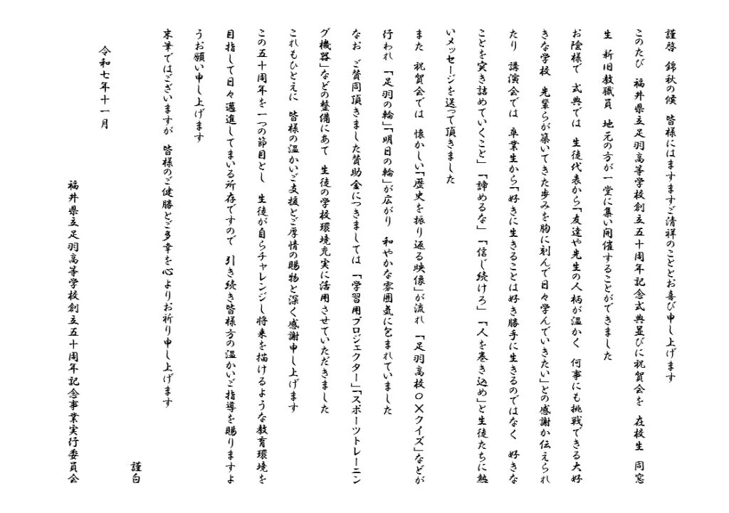 福井県立足羽高等学校創立50周年記念賛助御礼